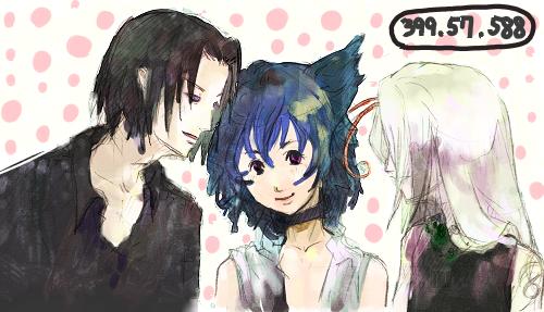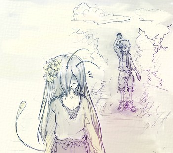 (手帳に、流れるような字で1行。 途中何度か手を止めたようで、ところどころインク溜まりが出来ている) …動くものと戯れる猫も、あんな感じ、なのでしょうかね。 --------- 陽は月とその身を入れ替え、辺りには夜の闇が広がっている。 『過ごしやすい時間がやってきました』 静かに草地を歩みながら、クインスは口元をほころばせた。 目を刺激する光のせいで、彼は昼が苦手だった。 しかし何よりその身を形成する組織の影響だろうか、本能が夜を好いていた。 クインスは西方に流れる川にたどり着くと、 闇に沈んだ川縁に腰掛け、細く長い息を吐き出した。 湿った風が束ねた髪の毛先をそっと撫でていく。 晒された瞳に届く月の光は柔らかで、とても優しい。 ああなんと心地よい… 「!」 刹那、クインスの緩んでいた緊張がいっぺんに張り詰めた。 深く身をかがめ、息を潜め、尻尾も地面に張り付け、 突き出した触角だけ、様子を伺うようにそうっと揺らす。 真剣そのものの顔には、お世辞にも目つきが良いとは言い難い鋭く細い瞳。 その瞳をさらに細めて、草の陰、じっと一点を睨む。 10秒...30秒......1分......... 「ヴォォーー」 突然、背後でウシガエルの鳴き声が響いた。 クインスはハッとした表情を浮かべると、そのまま立ち上がる。 そうしてバツの悪そうな顔で髪を解き、野営地への道を引き返した。 彼が去ったあと、草の陰からそろりと這い出してきたのは─ 一匹のコオロギ。 「いけません…いくら本能があっても……虫は…」 小さな小さな呟きが、夜の闇に溶けて消えた。
