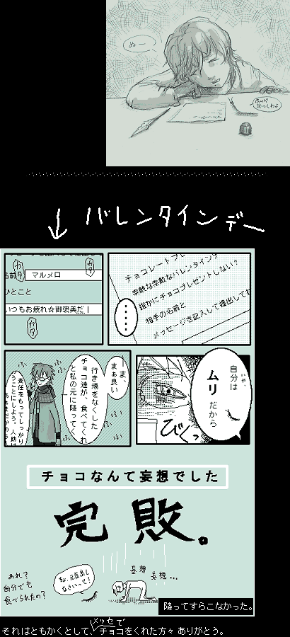 のんびりし過ぎてまとめるのを忘れておった。 今の時点で考えていることをつらつらと。 ----------- とりあえずコミュニティ内でのイベント、ということに。 参加者をアミダにかけて、当たった相手を黒々と描いてもらう。 ちなみにチョコをあげた者も、貰った者も、見事想いが成就しておっても参加は可能。 拒否して下手に参加者激減したら、何か悔しい。色々と。 ・参加者募集と共にロゴも募集。 ・作成、提出する画像サイズは3種。 横250×縦自由 …プロフ用 横60×縦60 …アイコン用 横80×縦100(切り抜いたり縮小したり) …並べて貼り付けてコミュ画像に ・出来上がったプロフ画像は、4月2~3週あたりに(14日を含めて)使用すること。 ・4/14(土)の夜は絵チャット開催予定日なので、ついでに何か黒い合作絵でも。 ・コミュ内に2枚以上描けるよーという者が何人かいれば、 絵を描けない者(コミュ内外問わず)対象に、モデル募集を行うのも良いかと思う。 これは明日コミュニティメッセージで尋ねてみる。 3/ 5: 17回更新時、コミュニティで簡単に告知と参加者募集 (数日中にイベント用ページ作成) 20: 24:00で参加受付〆 (もう少し早めるかも) 21: 抽選、描く相手決め 4/10: 絵提出〆切 14: この日を含めてプロフ画像使用 夜には絵チャット まぁこんな感じのことをまとめて、数日中にはイベント案内用ページを作成するつもりだ。 現在のコミュニティ参加者が66人だから、10人くらい参加してくれれば御の字かのぅ? となると、モデル募集は大分可能性が薄いと思う。 ひとまずまぁ、集団メッセージを設定してこねばの。