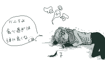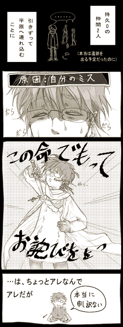 遺跡を出て、ようやく一息。 …と思ったらペットに食料を奪われ、体を壊し、ばたりと倒れた。 そんな夢を見た。夢にしては空腹の苦しみがリアルで焦った。 気を改めて再出発の準備にかかっておるが、荷物のやりくりに何とも困ってしまう。 うーむ、やはり少しくらいは体力をつけねばならんものかのぅ。 この身長で変に筋肉をつけると、みっともない見た目になりそうで怖いのだが。 というかそもそも筋トレなんてきつそうな運動、考えるだけで恐ろしい! (小さな文字で何か書いてある) ロデオボーイ……アブトロニック……?