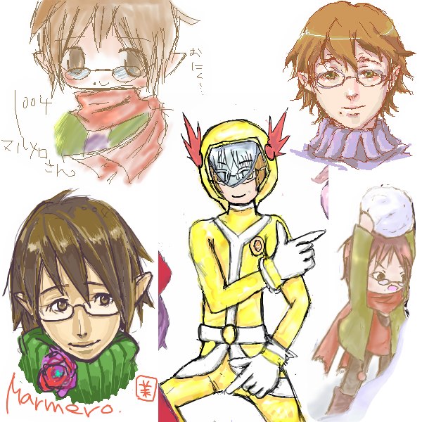 前の記録をつけている最中、睡魔に負けてしまった。 いかんいかん。 皆の絵については、 コミュニティサイトに展示コーナーを作り、そこへ纏めて飾ってきた。 良ければコミュニティ外の者にも覗いてもらいたい。 本当に素晴らしい。 また、あの時の楽しさが、少しでも参加者以外に伝わればと。 この日記に貼り付けた絵は、私をモデルにして描いて頂いたものの複製だ。 あまりに嬉しかったので、ここにも残しておく。 (重いのでクリックして原寸を見る人は注意) 真ん中で輝いているのと、その右で雪だまを抱えているものは、合作にて。 絡みのある絵をつくりあげるのは、またとても楽しかった。ふふ。 上の絵の作者: アリステイル殿、メルヴォ殿、セツナ殿、マツリ殿 多謝! 本当はアリステイル殿がもう一枚描いて下さったのだが、キャプチャをとるのが追いつかず…。無念。 だがありがとう。脳内で発売されたCD、ヒットすると良いな(脳内で?)