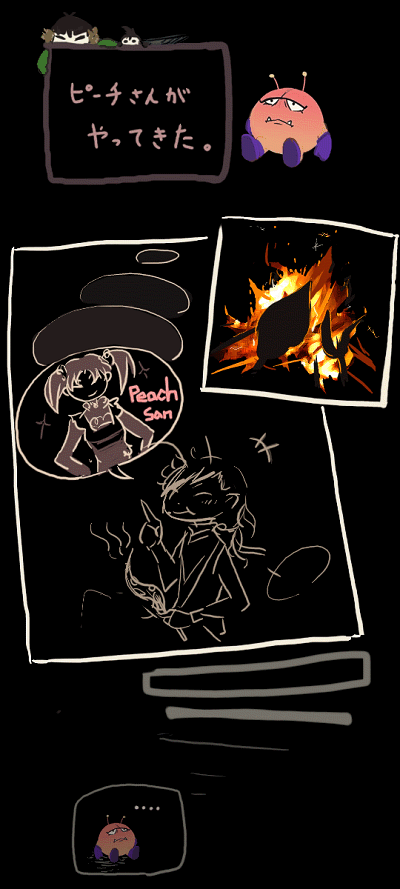 ある日の夜、ある場所にて。 イカ焼きの香ばしい香りと共に、 一人の男の声が夜風にのって運ばれてくる。 「… …… そうか、ピーチさん…… しかし…… いや、同じ名前の知り合いが…… とってもいい…… そう、フリフリの可愛い……」 皆が寝静まった頃。 小さな足音が野営地から草地を、そっと駆け抜けていった…